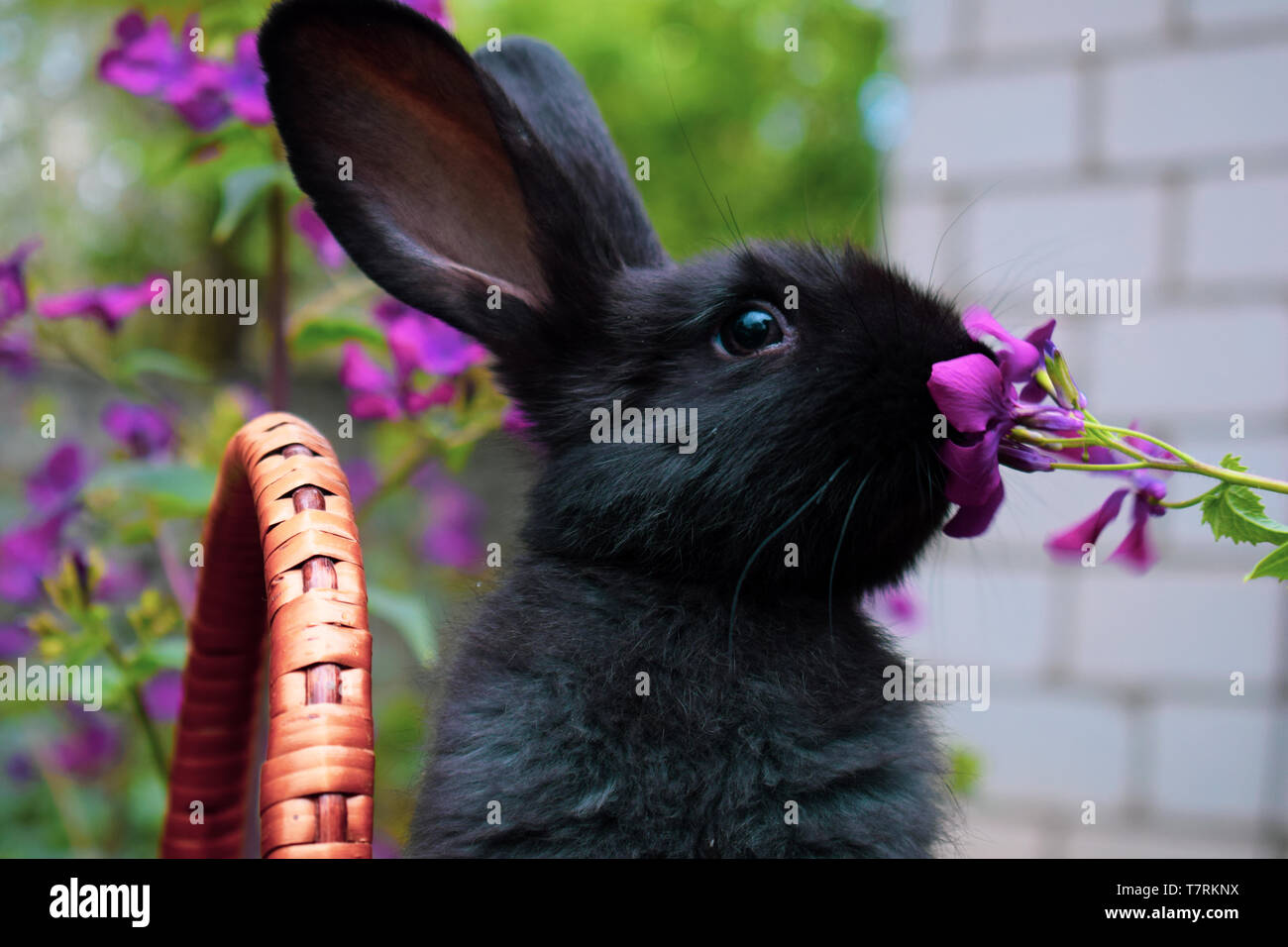 Cute Little Black Rabbit Sitting In A Basket And Eats Spring